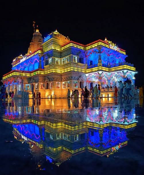 Prem Mandir is a breathtaking temple crafted from pure white marble. Dedicated to Radha Krishna and Sita Ram, it is admired for its detailed sculptures, artistic storytelling panels, and mesmerizing evening light displays that illuminate the entire complex beautifully.